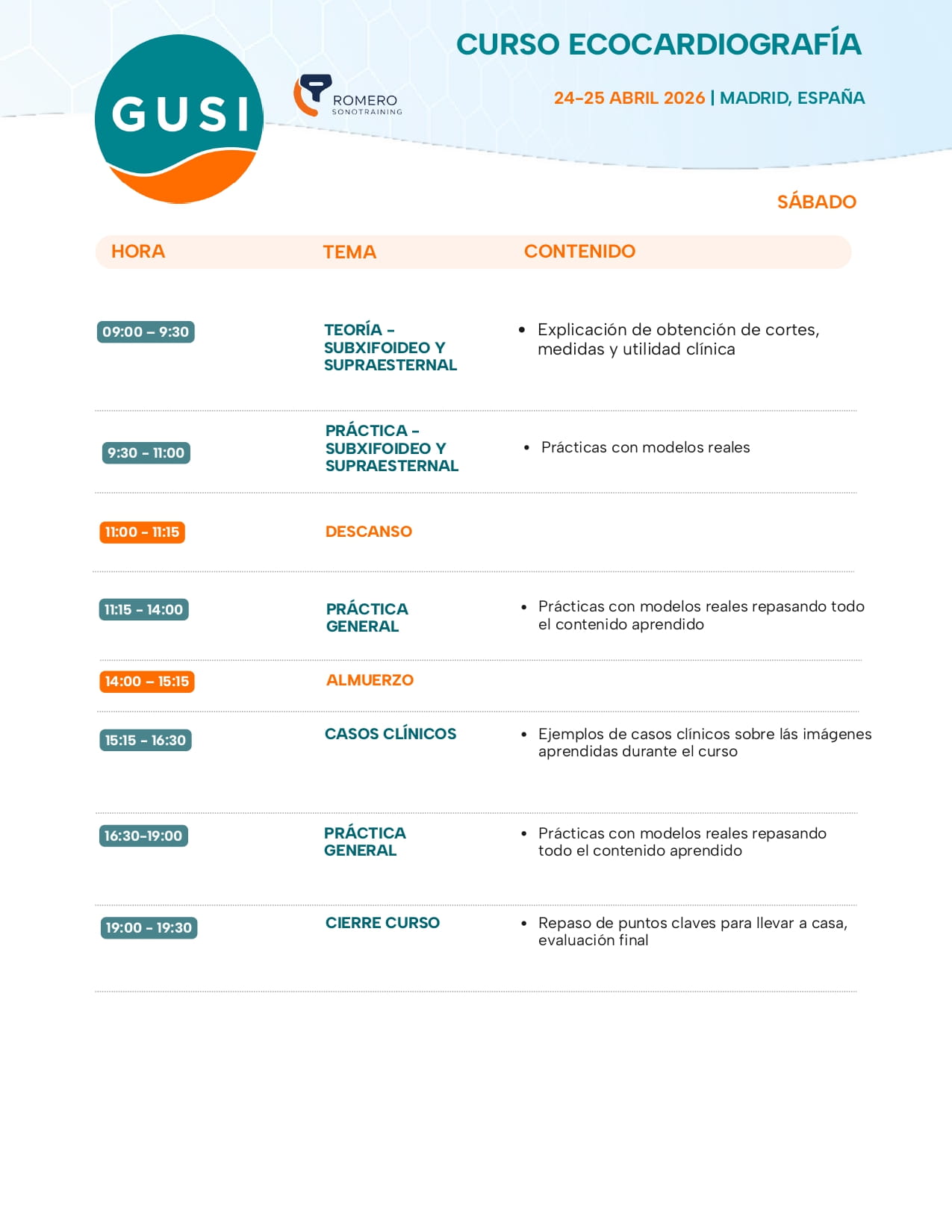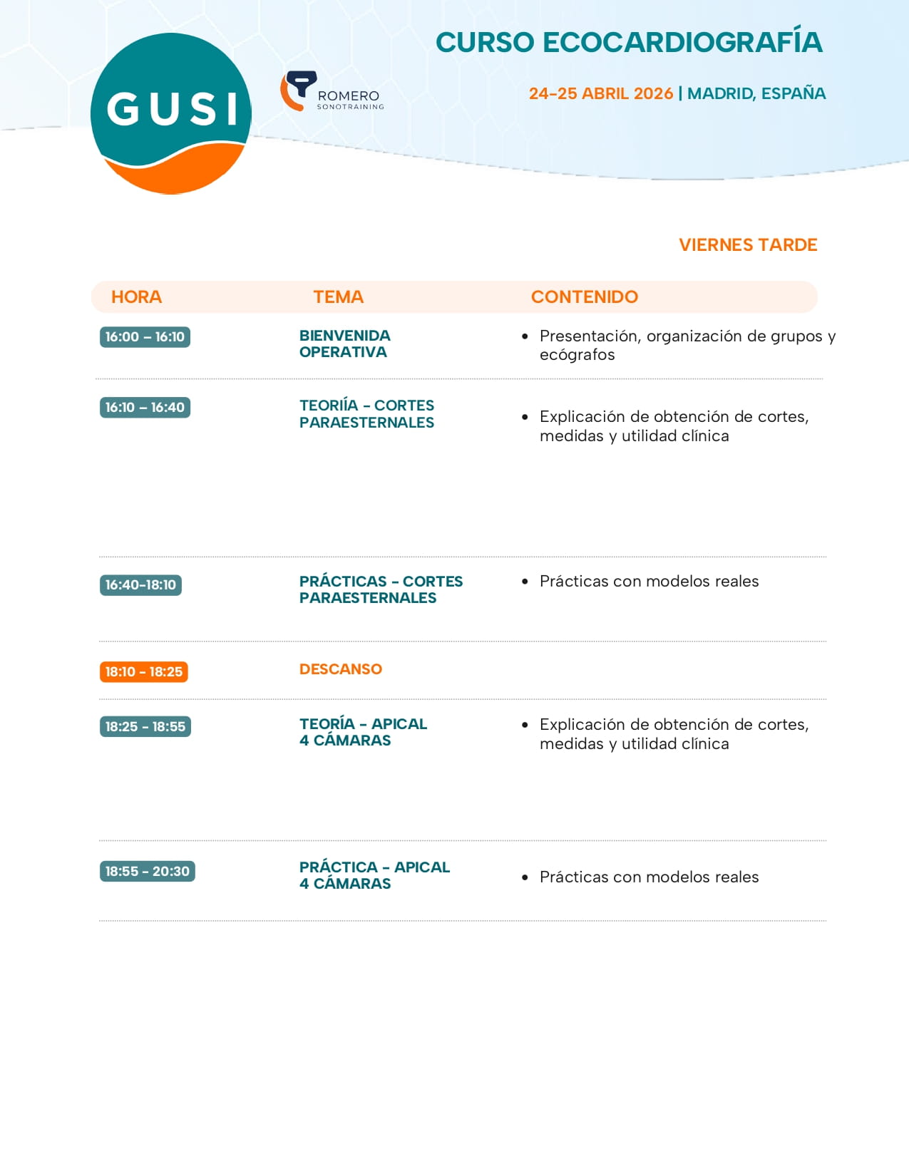 El Curso Práctico de Ecocardiografía está diseñado para médicos no cardiólogos que desean adquirir una base sólida y aplicable de ecocardiografía clínica. El enfoque es eminentemente práctico, con protocolos de ecografía cardíaca, prácticas supervisadas por expertos y trabajo con modelos en vivo, con equipo de ultrasonido proporcionado durante el curso.
