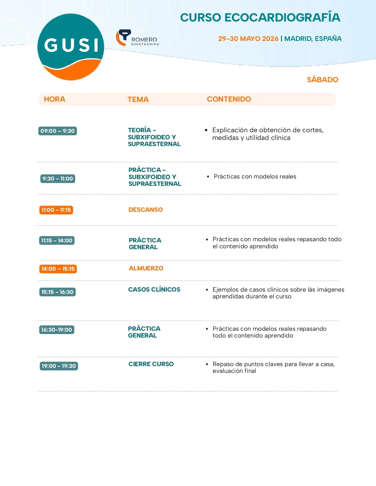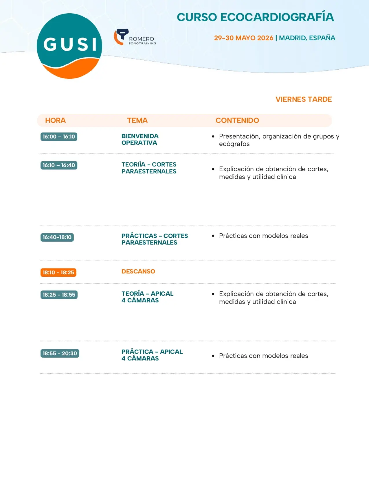 El Curso Práctico de Ecocardiografía está diseñado para médicos no cardiólogos que desean adquirir una base sólida y aplicable de ecocardiografía clínica. El enfoque es eminentemente práctico, con protocolos de ecografía cardíaca, prácticas supervisadas por expertos y trabajo con modelos en vivo, con equipo de ultrasonido proporcionado durante el curso.