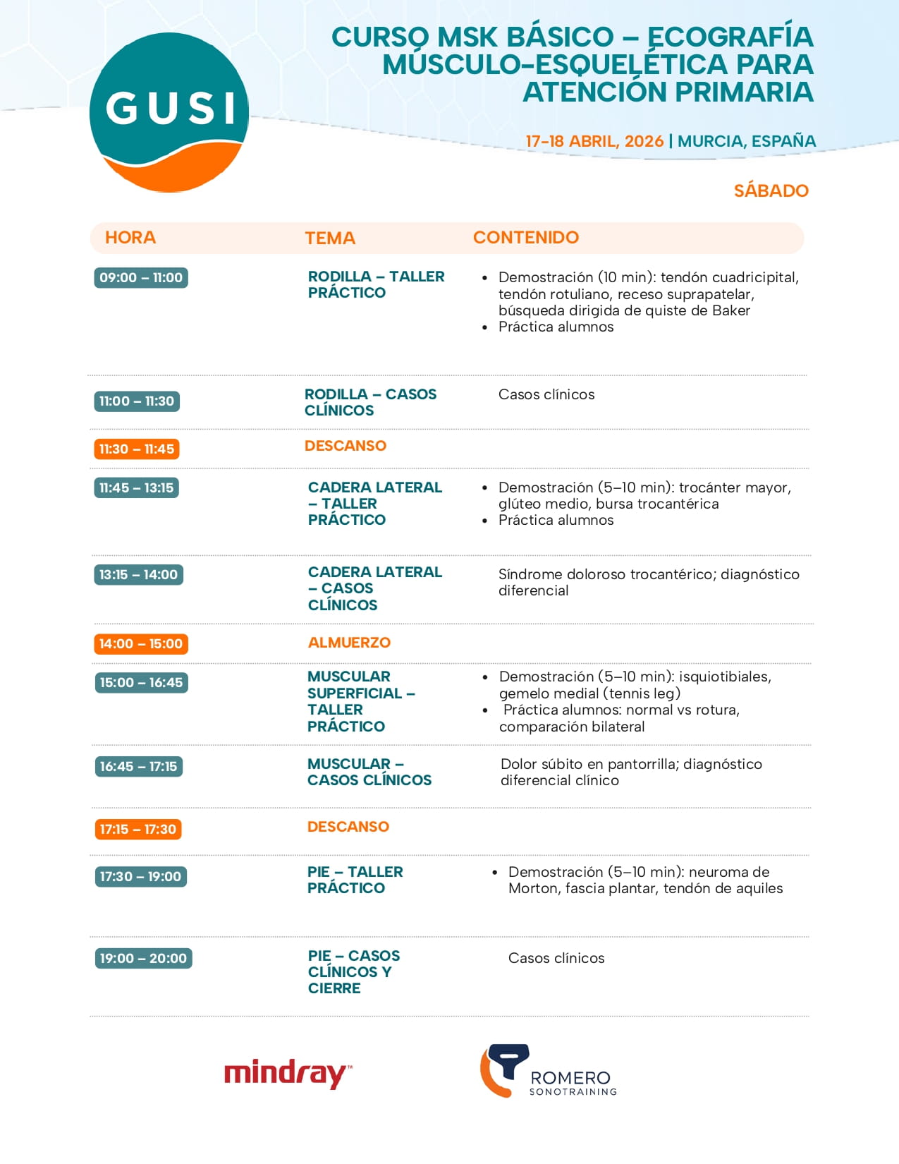 Ecografía MSK para Atención Primaria es un curso diseñado para profesionales de Atención Primaria que buscan iniciarse o reforzar su base en ecografía musculoesquelética (MSK) con un enfoque totalmente práctico. La formación se estructura para maximizar el tiempo de exploración real: primero, el alumno accede a vídeos teóricos previos en la plataforma online; después, el curso continúa con un entrenamiento presencial 100% práctico.