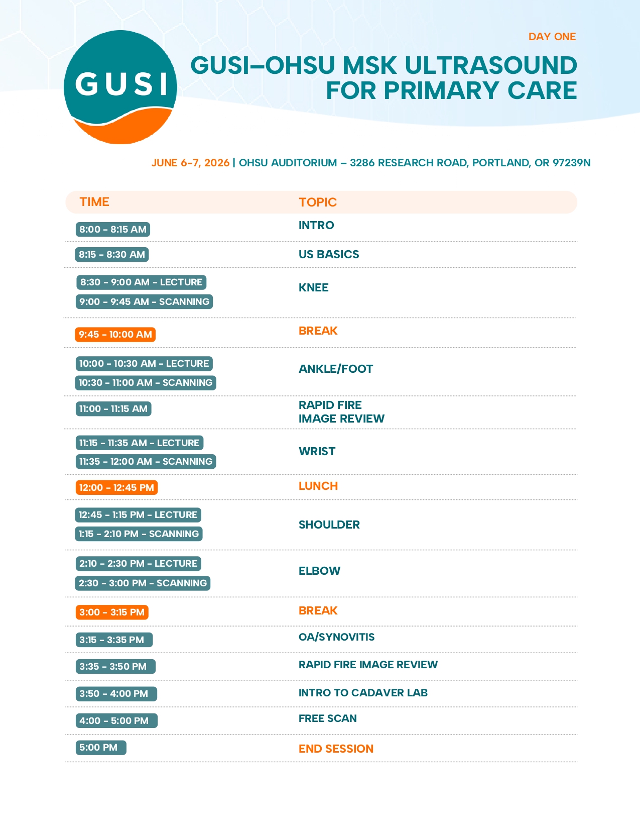 Day 1 focuses on practical scanning of core MSK examinations, with direct instruction and real-time feedback from expert faculty to help participants refine image acquisition and interpretation.