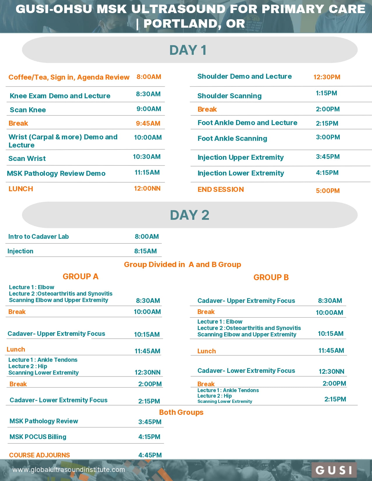 Day 1 focuses on practical scanning of core MSK examinations, with direct instruction and real-time feedback from expert faculty to help participants refine image acquisition and interpretation.