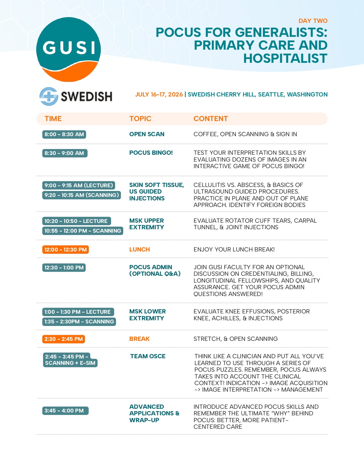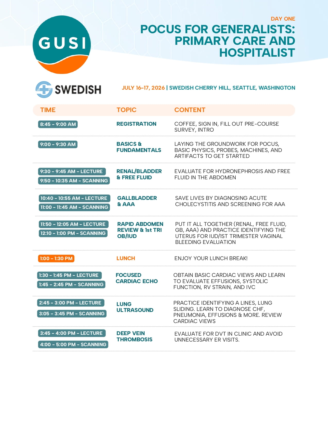 GUSI, in partnership with Swedish Health, presents the POCUS for Generalists + OB Review In-Person Bundle—a comprehensive ultrasound training experience designed for clinicians seeking practical, high-impact Point-of-Care Ultrasound education across both generalist and obstetric applications. Registering for the bundle lets participants save by enrolling in both courses together, while streamlining the learning experience into one coordinated training plan.