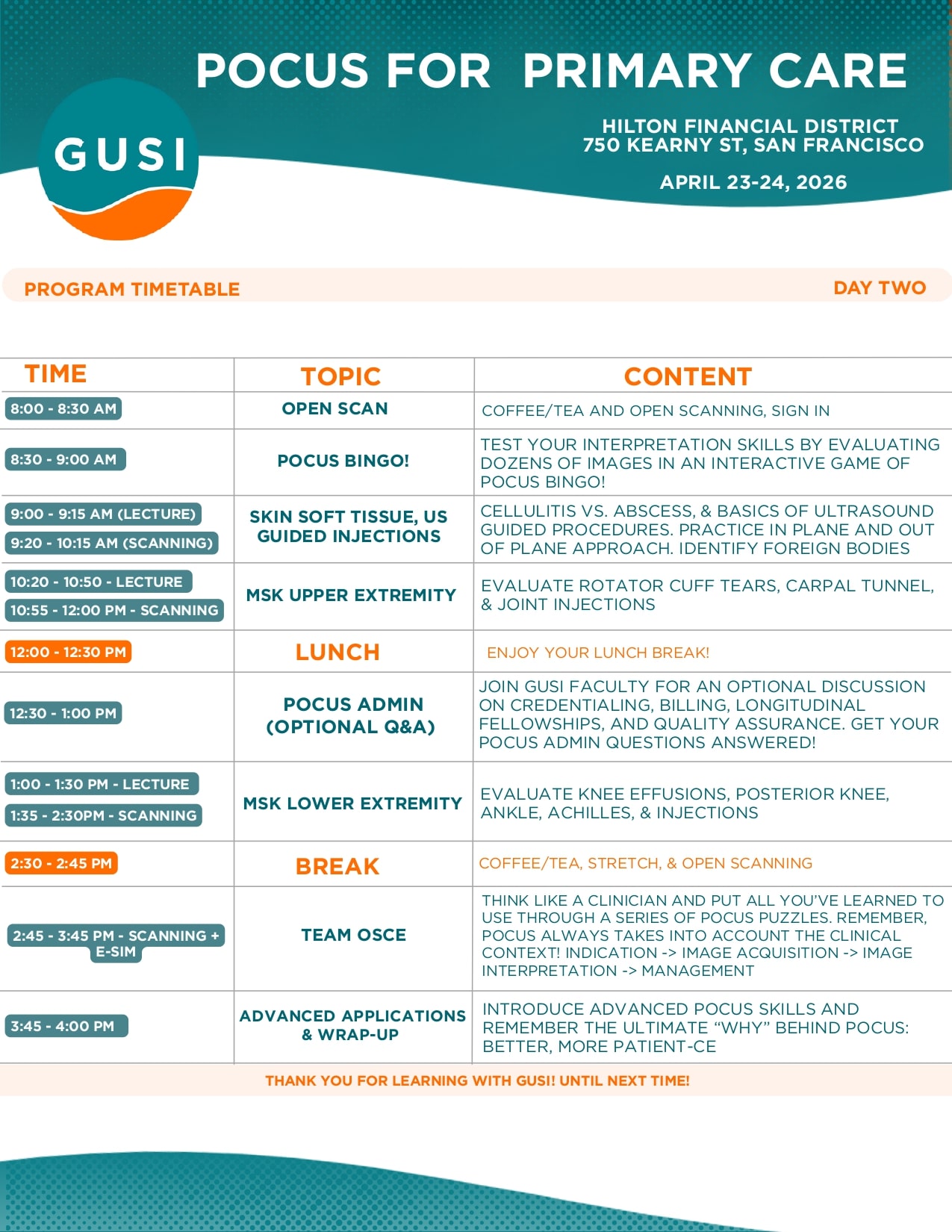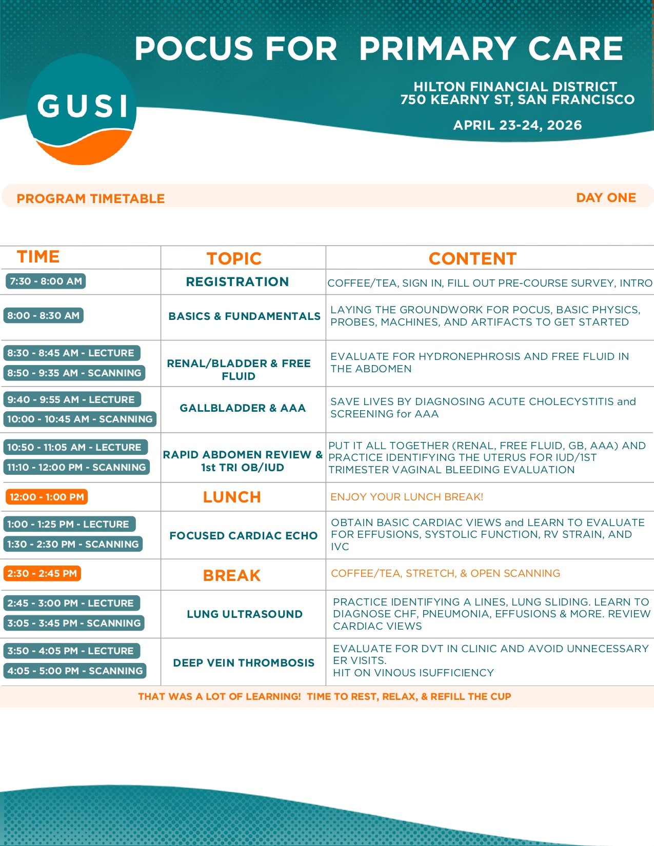 GUSI’s acclaimed two-day in-person Point of Care Ultrasound (POCUS) Training course combines high-yield lectures with immersive hands-on scanning sessions. This 13.5 CME course follows a flipped classroom model, designed to maximize scanning time with low instructor-to-learner and learner-to-ultrasound ratios. Taught by experienced physicians who are both expert educators and skilled POCUS practitioners, the course emphasizes practical skills and clinical relevance. Enrollment includes over three months of complimentary access to GUSI’s POCUS Essentials Online Course (25 CME hours, a $309 annual value), available immediately after registration. Located at the prestigious Hilton San Francisco Financial District.