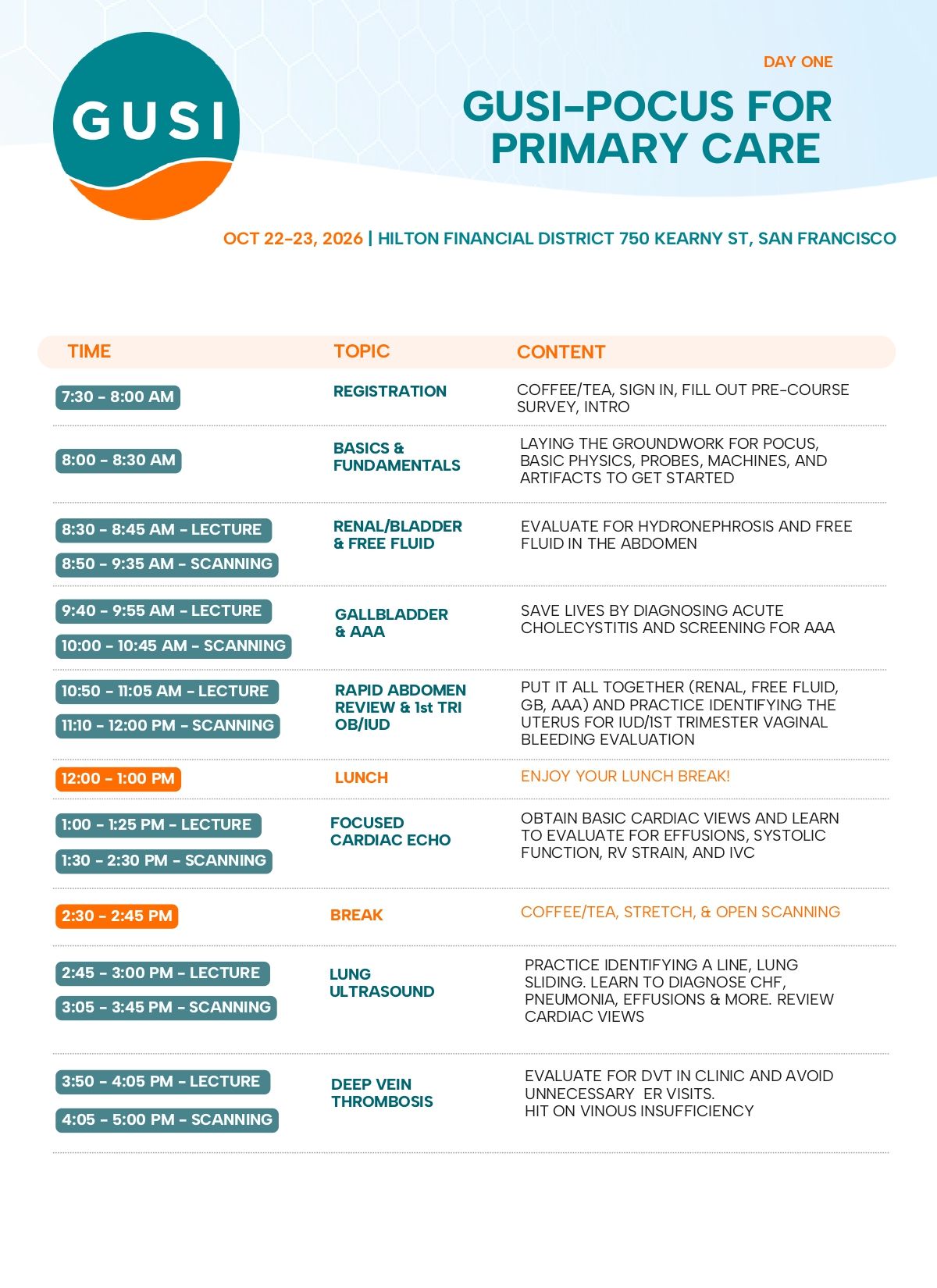 GUSI’s acclaimed two-day in-person Point of Care Ultrasound (POCUS) Training course combines high-yield lectures with immersive hands-on scanning sessions. This 13.5 CME course follows a flipped classroom model, designed to maximize scanning time with low instructor-to-learner and learner-to-ultrasound ratios. Taught by experienced physicians who are both expert educators and skilled POCUS practitioners, the course emphasizes practical skills and clinical relevance.